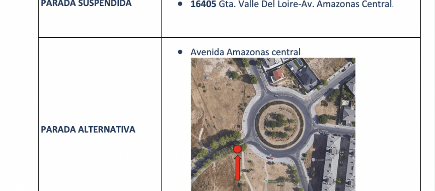En su lugar, y durante 10 semanas aproximadamente, la parada se ubicará a unos 10 metros del paso de cebra de Avenida Amazonas Central, justo antes de entrar en la glorieta de Loire, donde se instalará un poste provisional.