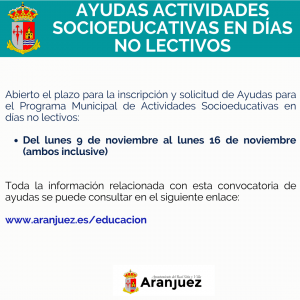 A partir de hoy lunes día 9 de noviembre y hasta el día 16 del mismo mes se encuentra abierto el plazo de inscripción y solicitud de ayudas para participar en el Programa Municipal de Actividades Socioeducativas en días no lectivos: “ABRIMOS EN NAVIDAD-JUGAMOS SEGUROS“.