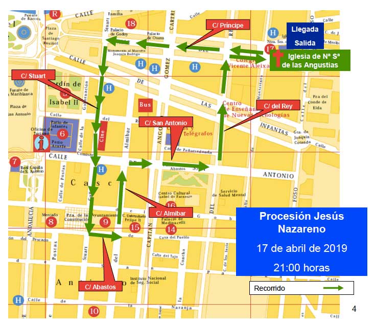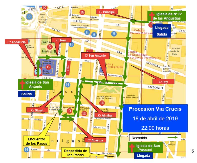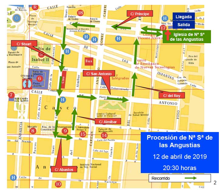 Recorrido: calles Príncipe, Stuart, Abastos, Almíbar, San Antonio, Rey y Príncipe.