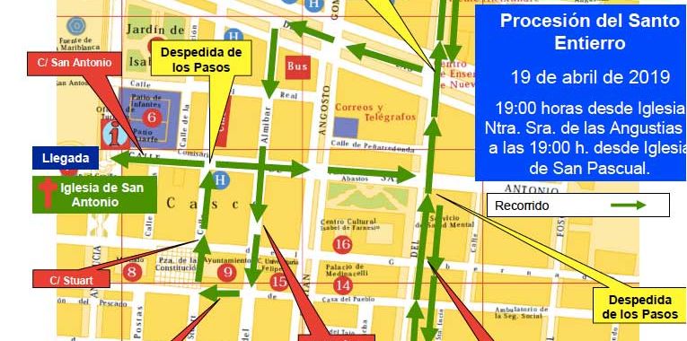 Se producirán cortes de tráfico en la Carrera de Andalucía (Gobernador y la Plaza de Santiago Rusiñol), San Antonio (desde la Carrera de Andalucía), Stuart (entre San Antonio y la Plaza de la Constitución), Gobernador (entre Almíbar y Carrera de Andalucía), Abastos (entre Postas y Rey), Capitán (entre San Pascual y Real, dirección Infantas) y Real (desde Gobernación).