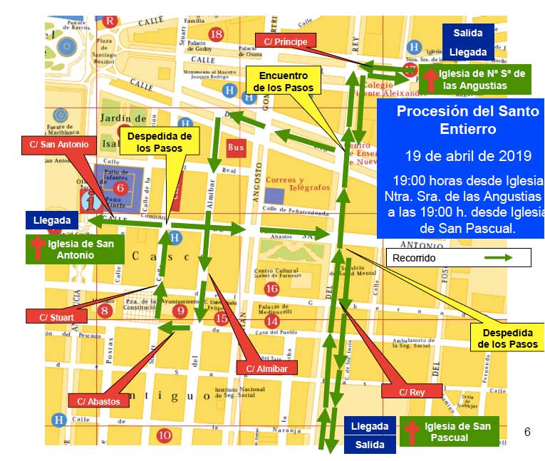 Recorrido: la procesión rodea la parroquia, subiendo por Foso (entre Mariblanca y Moreras) y regresando por la calle del Príncipe.
