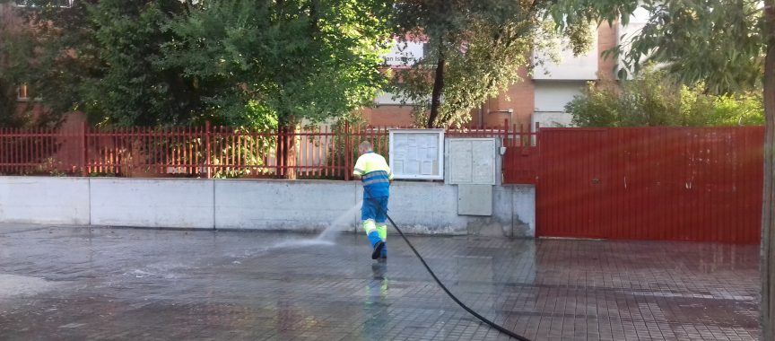 Durante estos días se ha procedido a la limpieza, el lavado y el desinfectado de los accesos y de los contenedores situados en los aledaños de cada uno de los colegios.