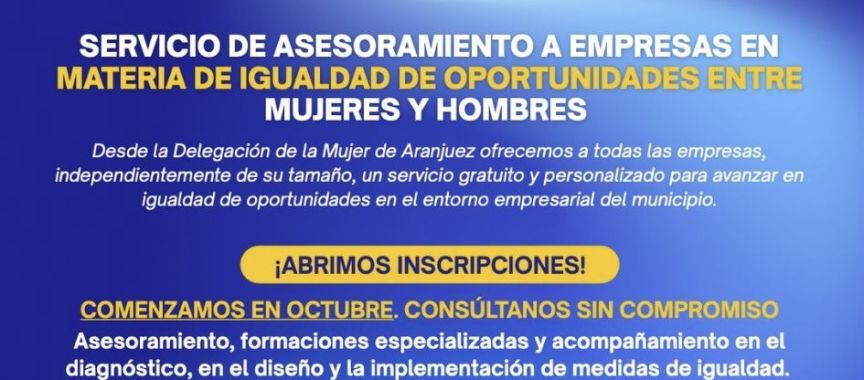 El Ayuntamiento de Aranjuez, a través de la Delegación de la Mujer, pone en marcha el ‘Servicio de Asesoramiento a Empresas en Igualdad de Oportunidades entre Mujeres y Hombres’, una iniciativa gratuita dirigida a todas las empresas del municipio, sin importar su tamaño o sector de actividad.