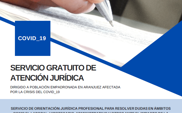 El Ayuntamiento de Aranjuez, a través de la Delegación de Servicios Sociales de Atención Social Primaria, ha puesto en marcha un servicio gratuito para todos los ribereños empadronados en Aranjuez, que se han visto afectados por la crisis del Covid 19, por el que podrán recibir atención y asesoramiento jurídico.