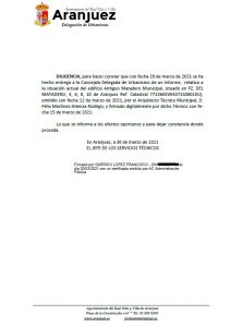 Miriam Picazo Alonso, Primera Teniente de Alcalde y Delegada de Urbanismo: “El informe del Técnico Municipal en el cual se concluye que ha de realizarse el desalojo inmediato del Antiguo Matadero Municipal me fue trasladado, por parte del Jefe de los Servicios Técnicos Municipales, a las 14 horas del lunes 29 de marzo”.