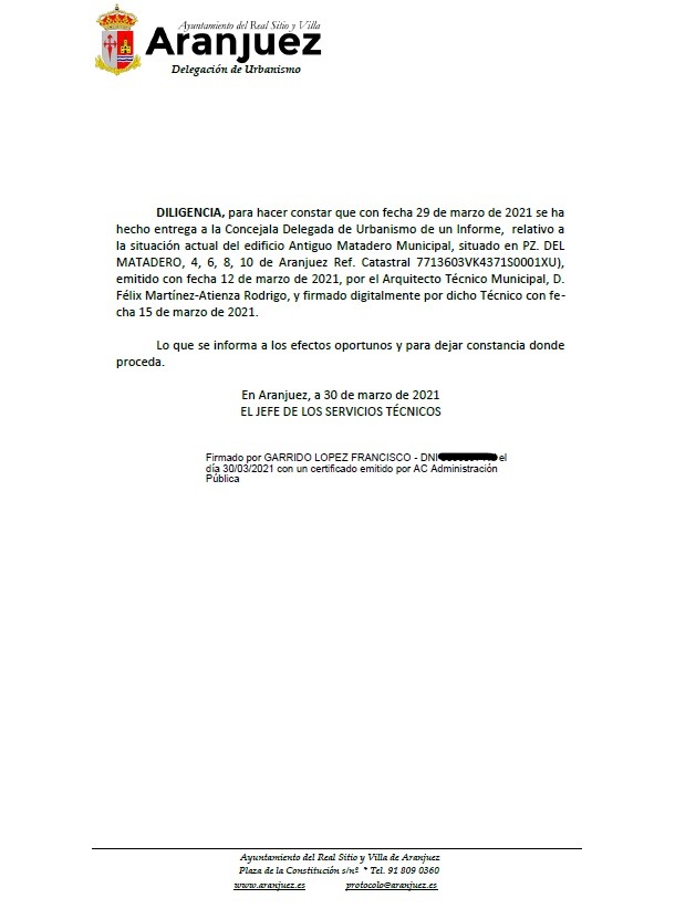 “Esta circunstancia la hace constar el propio Jefe de los Servicios Técnicos en una Diligencia firmada por él mismo, el pasado martes día 30 de marzo”