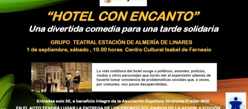 La comedia teatral “Hotel con Encanto” será llevada a cabo de forma desinteresada por la compañía Estación de Almería de Linares y gracias al apoyo del Ayuntamiento de Aranjuez en el marco de las Fiestas del Motín 2018. Los espectadores podrán pasar una tarde divertida al tiempo que colaboran con la ardua tarea de hacer más fácil el día a día entorno a un síndrome muchas veces desconocido pero que afecta a más de 3.000 personas en España.