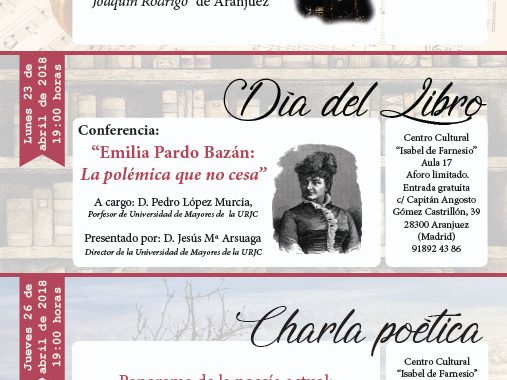 Ya en la jornada del 23 de abril, la Biblioteca Municipal ‘Álvarez de Quindós’ y la Universidad de Mayores de la URJC presentan la conferencia ‘Emilia Pardo Bazán: la polémica que no cesa’, a cargo de Pedro López Murcia, y que tendrá lugar a partir de las 19 horas en el Aula 17 del Centro Cultural Isabel de Farnesio.