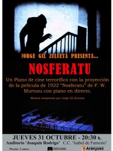 Aranjuez, 30-octubre-2019- La noche de mañana jueves, día 31 de octubre, se celebra la noche de difuntos o Halloween y Aranjuez quiere recuperar una de las películas clásicas convertida en cine de culto, “Nosferatu” del director F. W. Murnau. En esta ocasión se ha querido crear la atmósfera más terrorífica y se proyectará la película con piano en directo. “Nosferatu, una sinfonía del horror” corre a cargo de Jorge Gil Zulueta, que interpretará composiciones compuestas por él y realizadas para esta película.