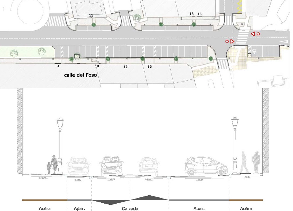 El primer tramo de calle, que comprende el tramo de Foso entre Infantas y Príncipe, incluye la renovación del firme de la calzada, la repoblación de las marras en el arbolado , la reordenación de las zonas de carga y descarga y de las islas de recogida de basuras.
