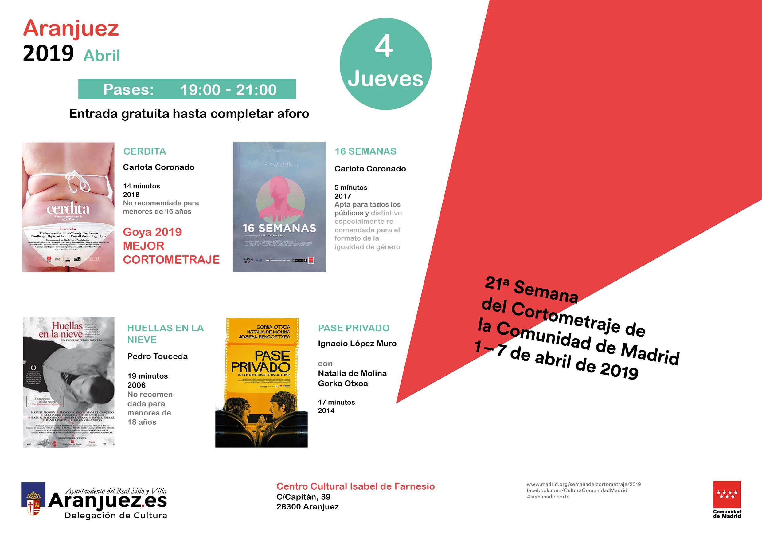 La 21ª Semana del Cortometraje de la Comunidad de Madrid ‘Madrid en Corto’ regresa este jueves 4 de abril a Aranjuez con la exhibición de un total de 10 cortometrajes en dos sesiones distintas, una matinal destinada al público infantil y otra vespertina para el público en general, que tendrán lugar en el Auditorio Joaquín Rodrigo del Centro Cultural Isabel de Farnesio.