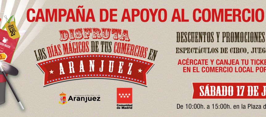 De esta forma, el próximo sábado 17 de julio, de 10 a 15h, se celebrará en Aranjuez, en la Plaza de la Constitución, la Campaña “Comercios Mágicos”, organizada por la Comunidad de Madrid con la colaboración de las Delegaciones de Dinamización Económica, Comercio y Hostelería del Ayuntamiento de Aranjuez, y a la que se han adherido, hasta la fecha, 97 establecimientos de nuestra localidad.
