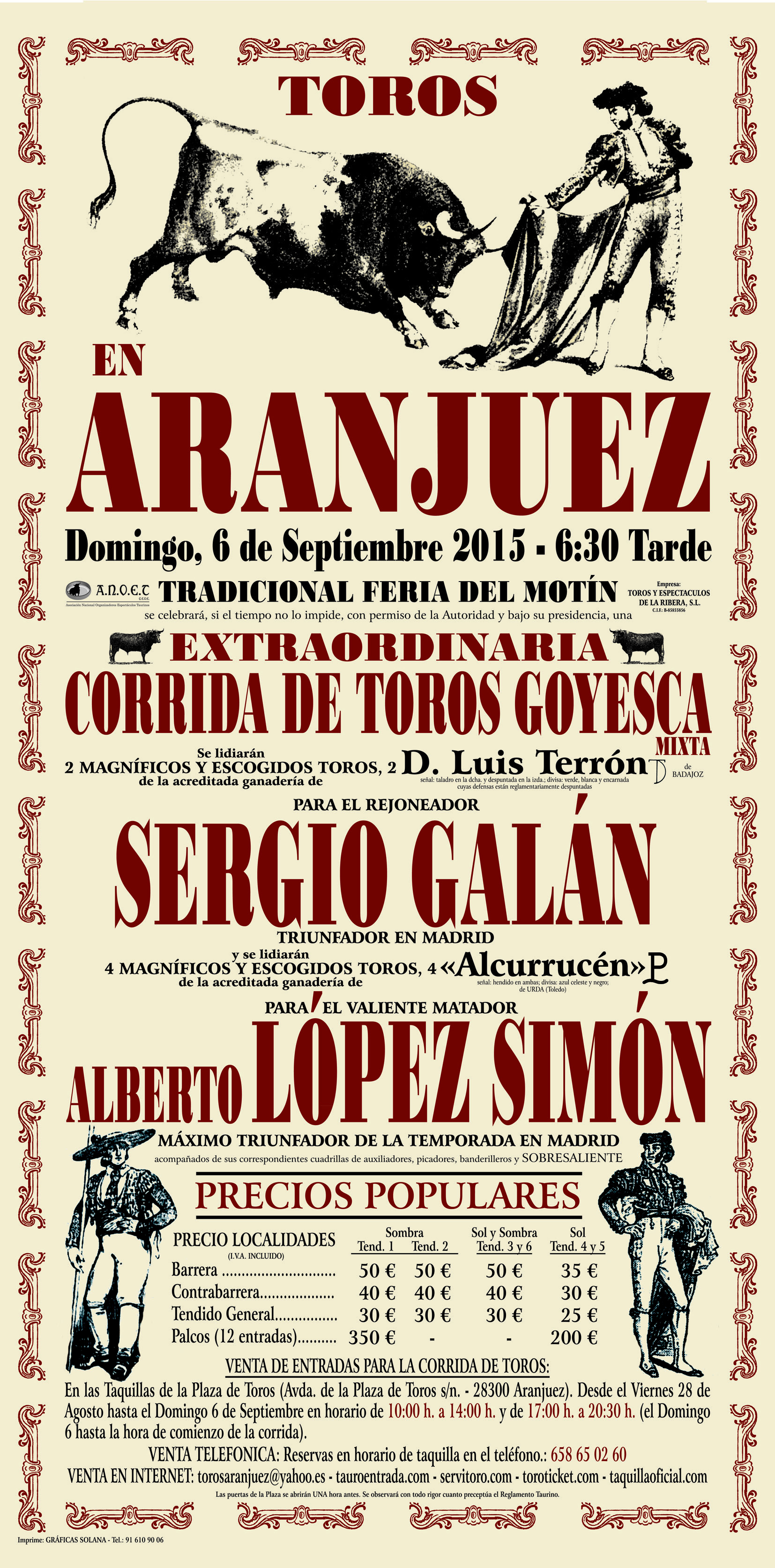 Las entradas se pueden adquirir en las taquillas de la propia Plaza de Toros desde el viernes 29 de agosto hasta el domingo 6 de septiembre en horario de 10 a 14 horas y de 17 a 20:30 (el domingo 6 hasta la hora de la corrida), así como a través de venta telefónica (reservas en horaria de taquilla en el teléfono 658,65,02,60) e Internet (torosaranjuez@yahoo.es, tauroentrada.com, servitoro.com, toroticket.com y taquillaoficial.com).