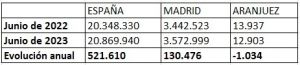 Desde la delegación de empleo del Ayuntamiento de Aranjuez, con fecha de hoy (3 de agosto de 2023), se comunica a los vecinos y vecinas: «BAJA EL PARO EN EL MES DE JULIO EN 96 PERSONAS». Se traslada un breve nota, en la que se viene a informar que en términos interanuales, de julio de 2022 a julio de 2023, el desempleo ha descendido en 123 personas. Se termina diciendo que: en nuestra ciudad se ha reducido el desempleo en 2,76%, teniendo en cuenta que en la Comunidad de Madrid ha bajado un 0,97% y en el conjunto de España un 0,41%, estamos ante datos muy positivos», dice el concejal delegado.