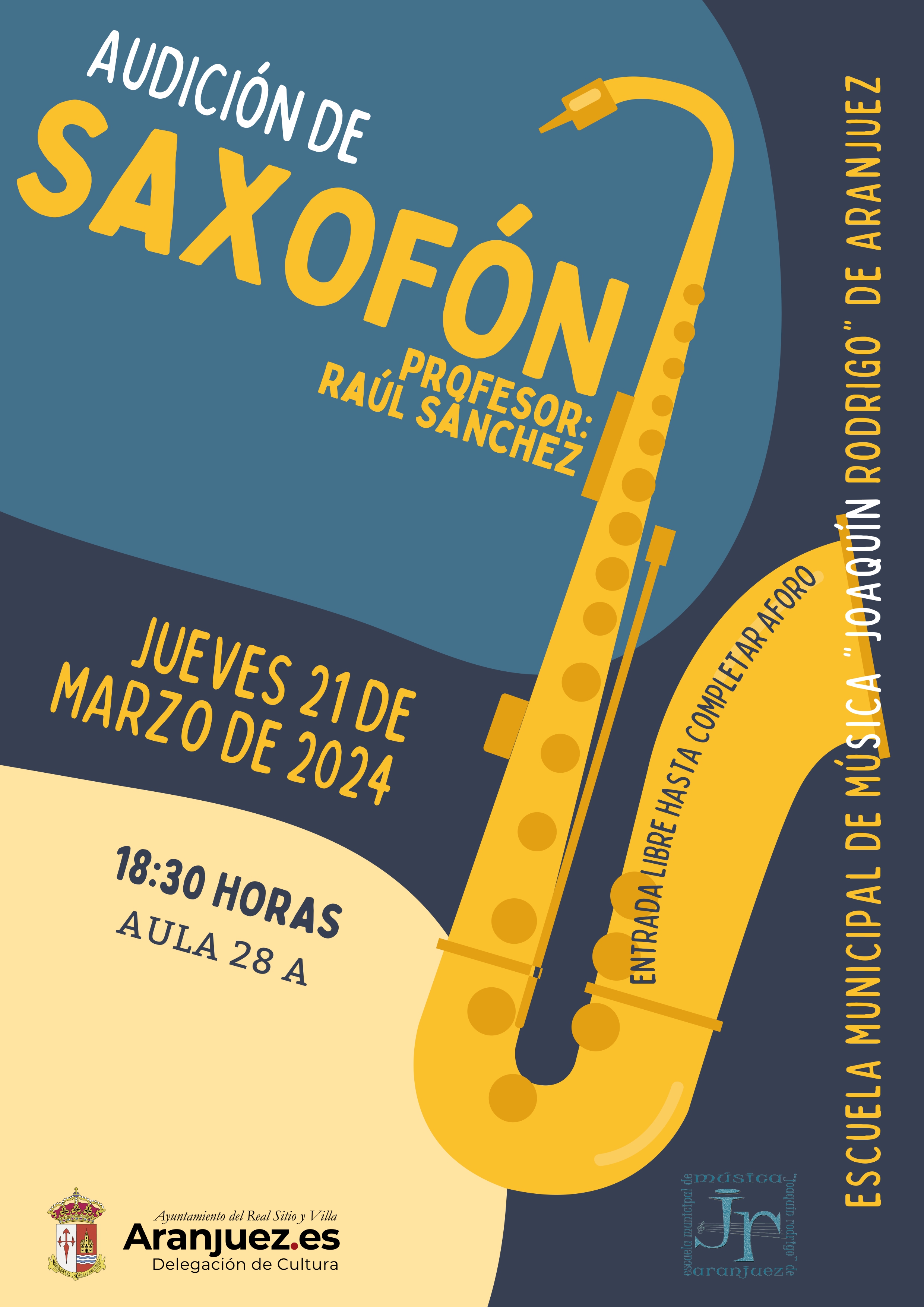 Los alumnos de saxofón así como el conjunto de saxofones de la Escuela Municipal de Música ofrecerán su audición de aula con un variado repertorio que incluirá obras de artistas de fama mundial. Los alumnos mostrarán su progreso a lo largo de este curso y el grupo de saxofones demostrará el alto nivel que poco a poco ha ido alcanzando bajo la batuta de su profesor y director Raúl Sánchez.
