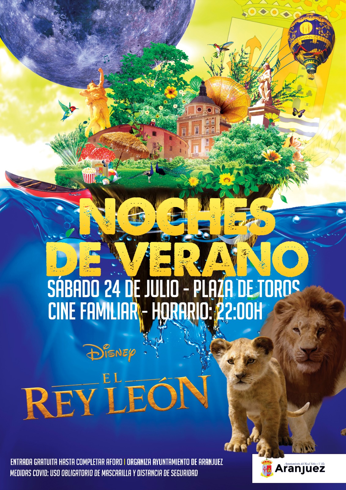 sab24jul22:0022:00CINE FAMILIAR. “EL REY LEÓN”“Las noches de verano en Aranjuez”. Sábado día 24 de julio a las 22.00 horas. Plaza de Toros de Aranjuez. Entrada gratuita hasta completar el aforo permitido