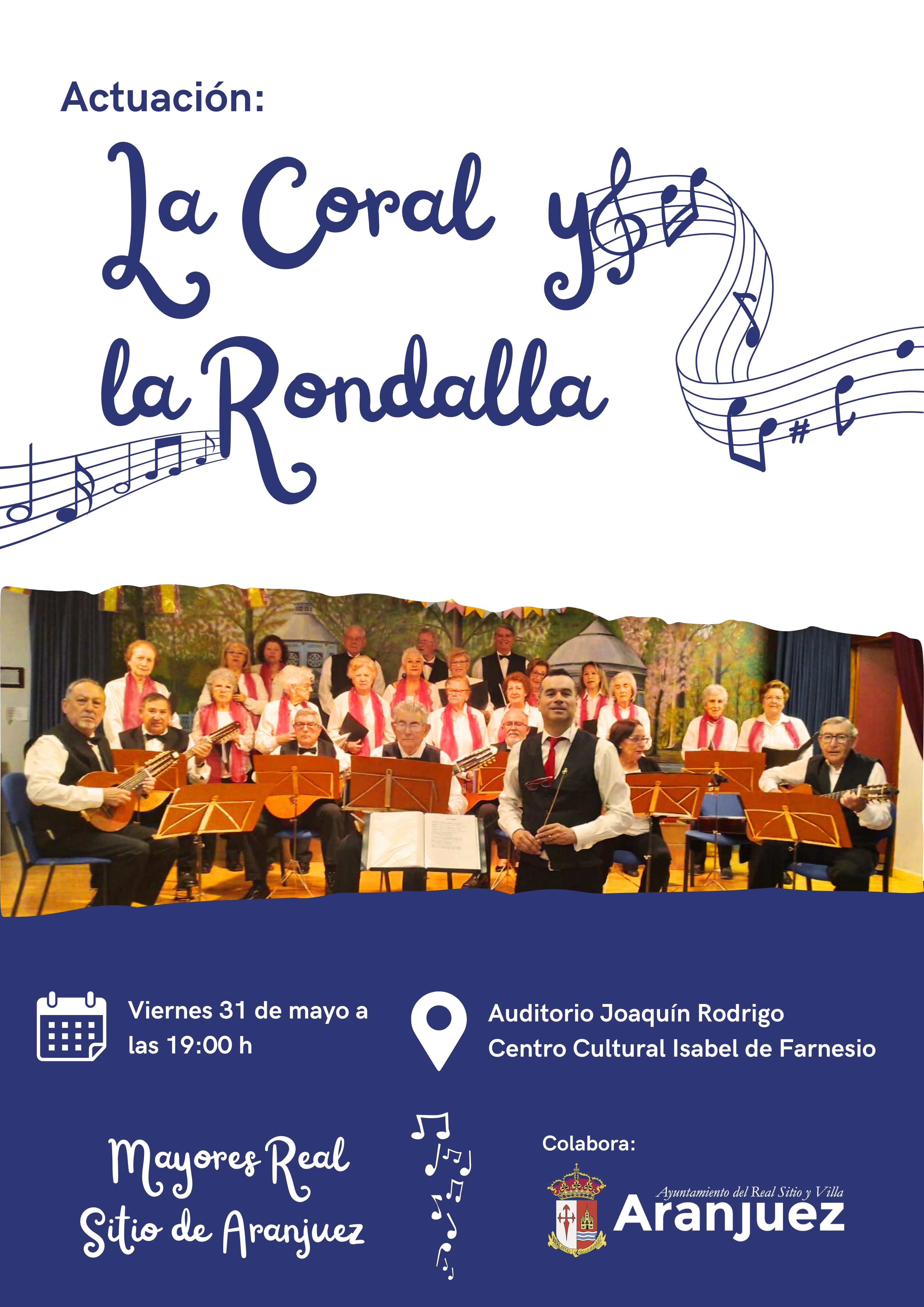 vie31may19:00CONCIERTO DE LA RONDALLA Y CORAL DE MAYORES REAL SITIO DE ARANJUEZViernes, 31 de mayo. 19:00 h. - Auditorio Joaquín Rodrigo. C.C. Isabel de Farnesio - Entrada gratuita hasta completar aforo