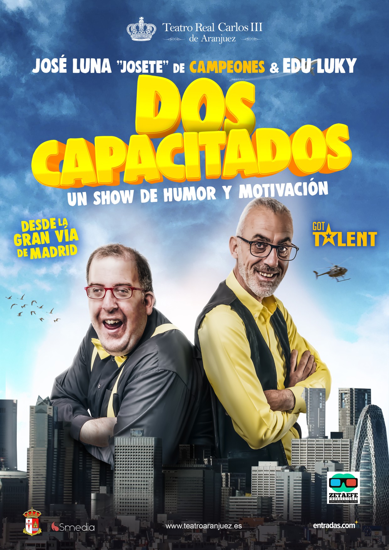 Dos Capacitados es un show diferente, valiente, único, muy útil para mejorar la salud mental y con el que troncharnos de risa a partir de las extraordinarias vivencias y logros de Josete (José de Luna), que es un ejemplo claro, sincero y real, en vivo y en directo, de cómo actuar en la vida para sentirnos bien. Y al que probablemente conocerás de la famosa película «Campeones».