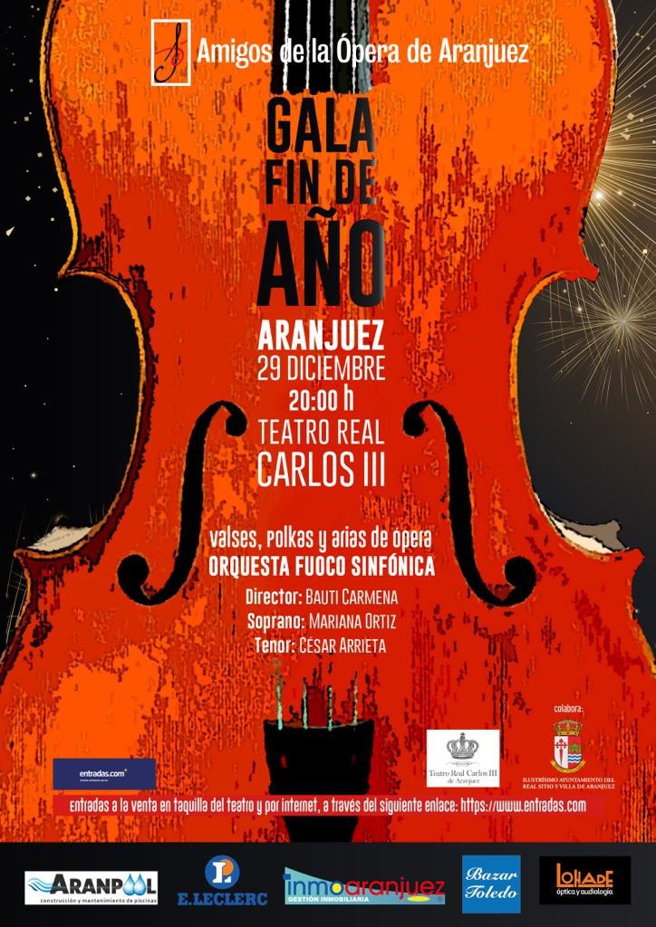 La Asociación de Amigos de la Ópera de Aranjuez presenta ‘Gran Gala Fin de Año’, concierto por la Orquesta Fuoco Sinfónica bajo la batuta de su director Bauti Carmena y con las voces de la soprano Mariana Ortiz y el tenor César Arrieta. Se interpretarán valses de J. Strauss, polkas y arias de ópera de Puccini, Donizetti, Gounod, Lehar y otros compositores románticos.