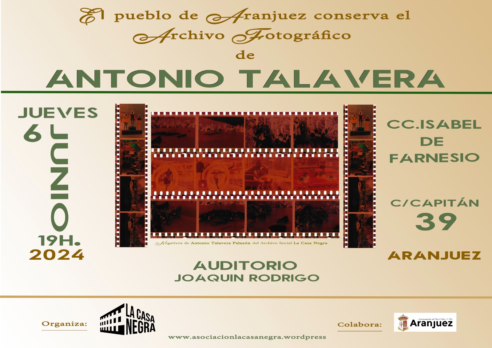 Celebrar una conferencia en torno a la figura del que fuera cronista oficial gráfico de esta localidad, Antonio Talavera. Se presentará con audiovisuales el contenido de su archivo personal y se explicarán detalladamente las tareas que el equipo de trabajo está llevando a cabo en la catalogación, digitalización y conservación del legado. Coincidiendo con esta conferencia se inaugurará una campaña de financiación para conseguir fondos para la conservación de la obra de Antonio Talavera como parte de la historia gráfica de Aranjuez.