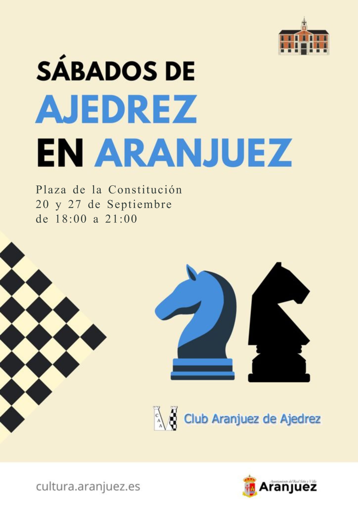 20sep(sep 20)18:0027(sep 27)18:00SABADOS DE AJEDREZ EN ARANJUEZ20 Y 27 DE SEPTIEMBRE PLAZA DEL AYUNTAMIENTO DE 18H A 21H