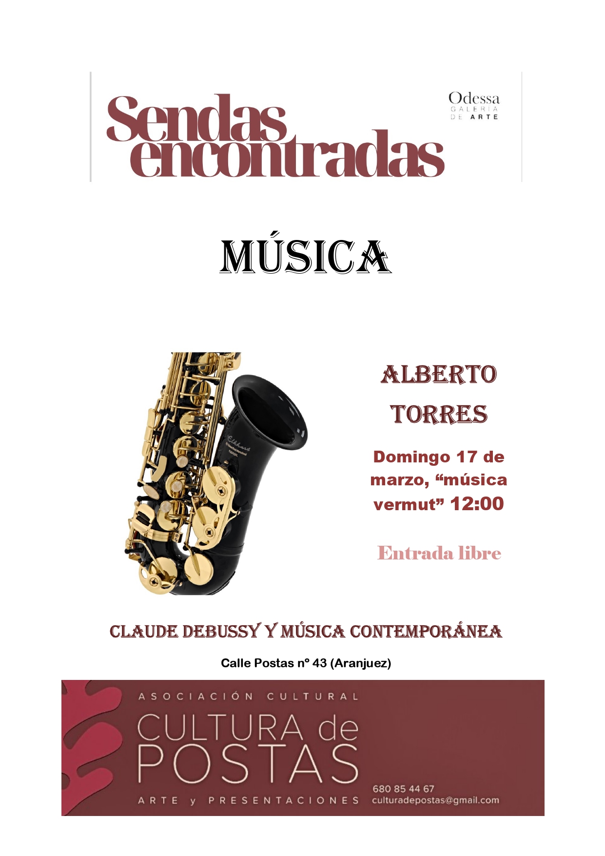 dom17mar12:00Sendas Encontradas – Concierto de Saxofón. Alberto TorresDomingo, 17 de marzo de 2024. 12:00 horas. Asociación Cultural Cultura de Postas. Entrada libre hasta completar aforo