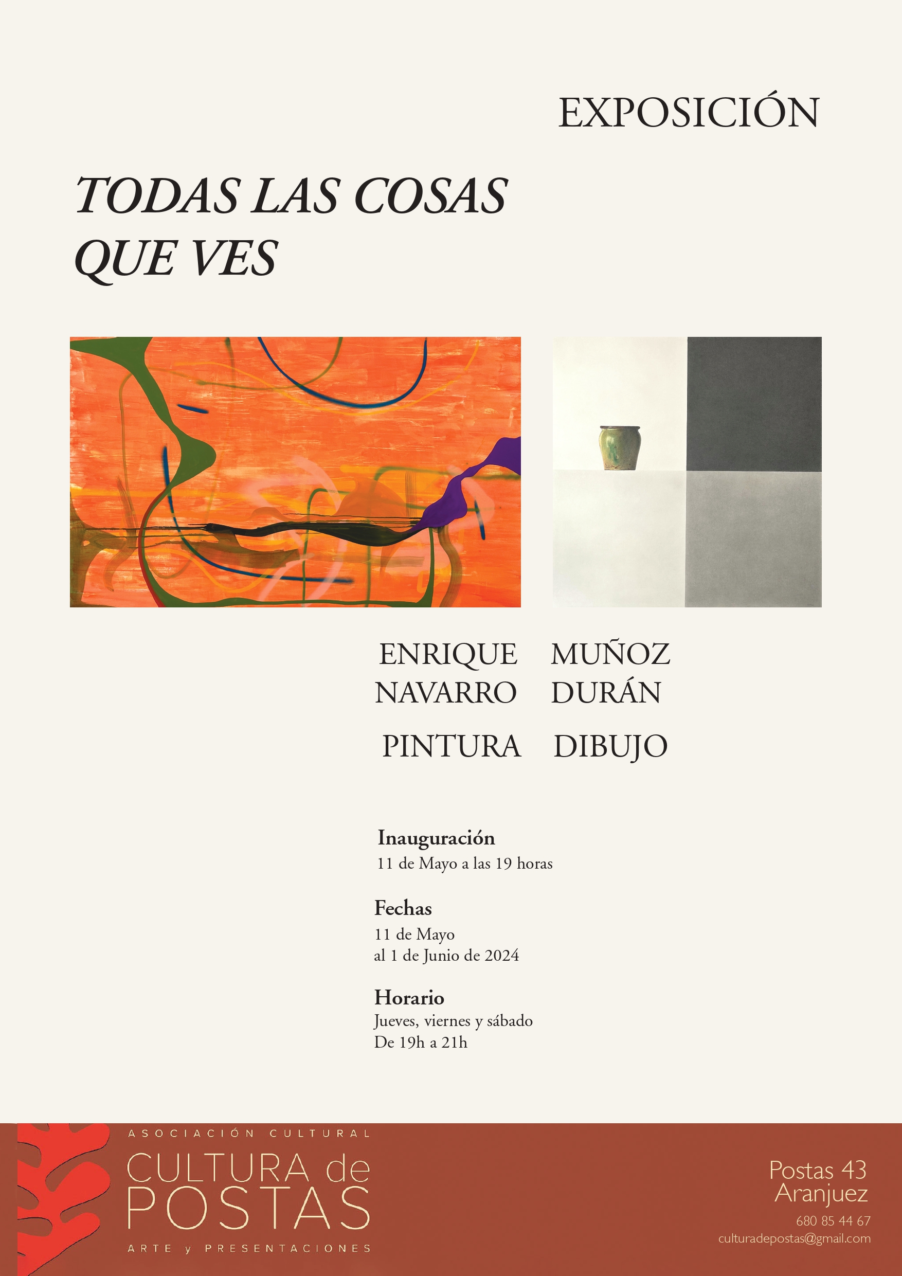 Exposición de Pintura y Dibujo a cargo de Enrique Navarro y Muñoz Durán. Inauguración: sábado, 11 de mayo a las 19:00 horas.