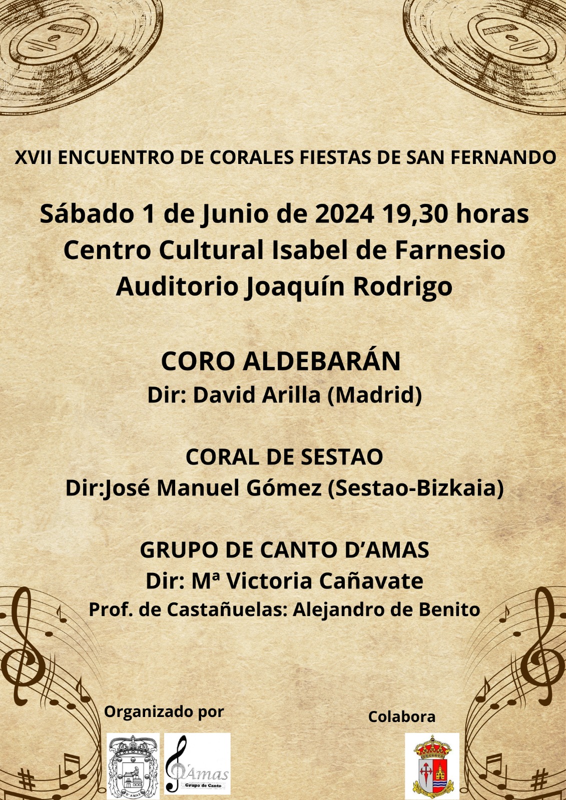 XVII ENCUENTRO DE CORALES DE ARANJUEZ FIESTAS DE SAN FERNANDO CORO ALDEBARÁN Dir. David Arilla (Madrid) CORAL DE SESTAO Dir. José Manuel Gómez (Sestao-Bizkaia) GRUPO DE CANTO D’AMAS (ARANJUEZ) Dir. M.ª Victoria Cañavate. Prof. de castañuelas: Alejandro