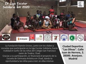 La fundación Ramón Grosso junto con la escuela municipal de gimnasia artística de Aranjuez y el resto de escuelas y clubes participantes disputarán la primera jornada solidaria con el fin de hacer realidad el sueño de las niñas del Colegio San Francisco Javier de Toukra (Chad, África Central) ayudando a la financiación del proyecto de la creación de una escuela de gimnasia artística en dicho lugar. La escuela municipal de gimnasia artística de Aranjuez participará con un total de 40 equipos de los 73 inscritos los cuales comprenden edades entre los 4 y 16 años.