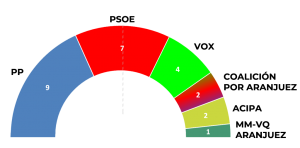 Está formada por el Alcalde y doce concejales – ocho del Partido Popular (PP) y cuatro de VOX- que conforman el Gobierno Municipal; y doce concejales – siete del Partido Socialista Obrero Español (PSOE), dos de Coalición por Aranjuez, dos de la Agrupación Ciudadana Independiente por Aranjuez (ACIPA) y uno de MM-VQ Aranjuez – que conforman la Oposición.